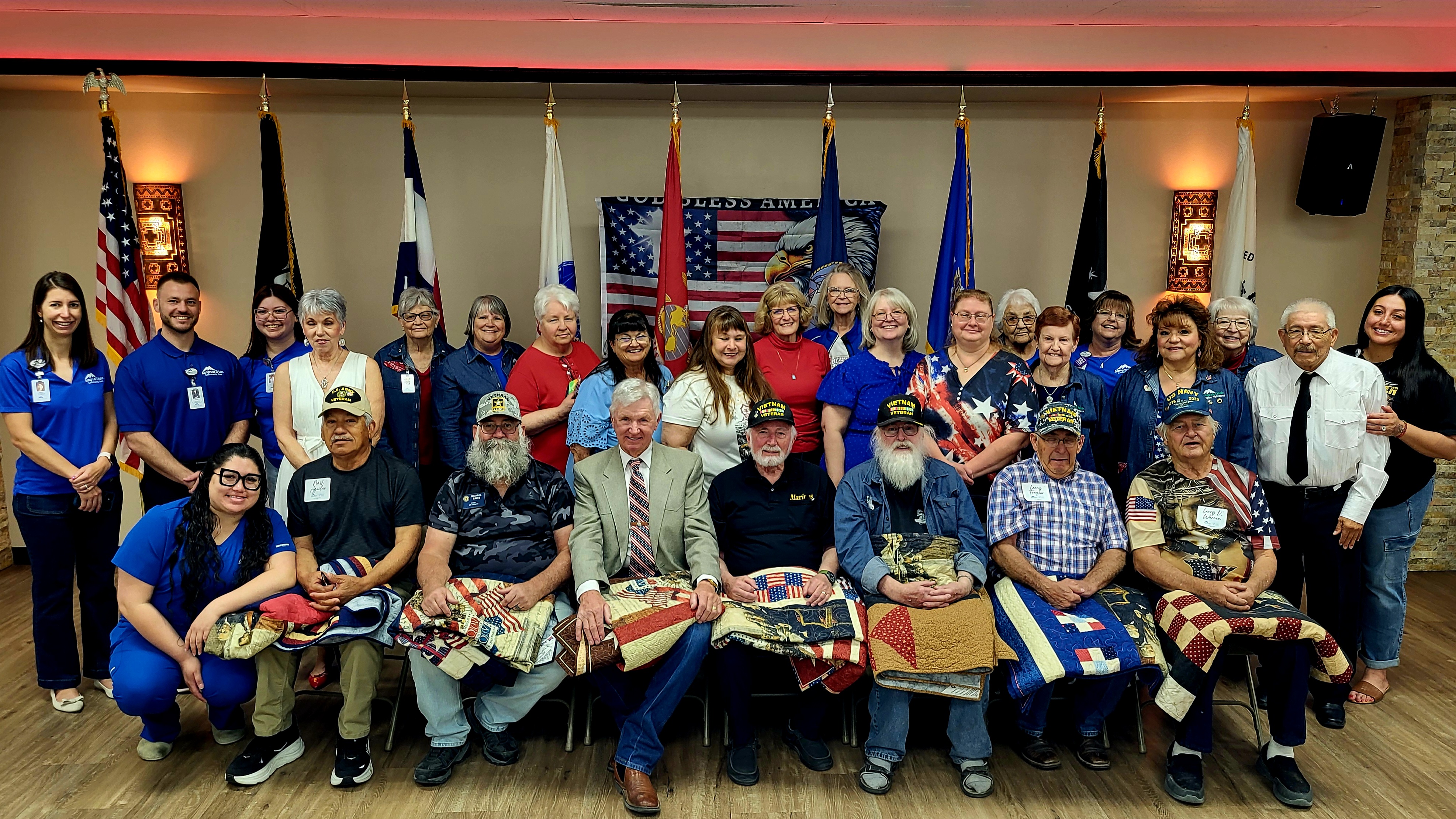 Description: Sangre de Cristo Community Care honored Vietnam veterans with a Quilts of Valor ceremony and luncheon in La Junta, recognizing service members with handmade quilts and community support.