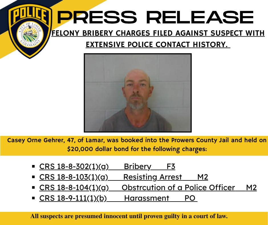Description: A 47-year-old Lamar man was arrested after causing a disturbance at Northside Park and allegedly attempting to bribe a police officer during transport. The suspect was booked into Prowers County Jail on a $20,000 bond. Read the Full Press Release from the Lamar Police Department...