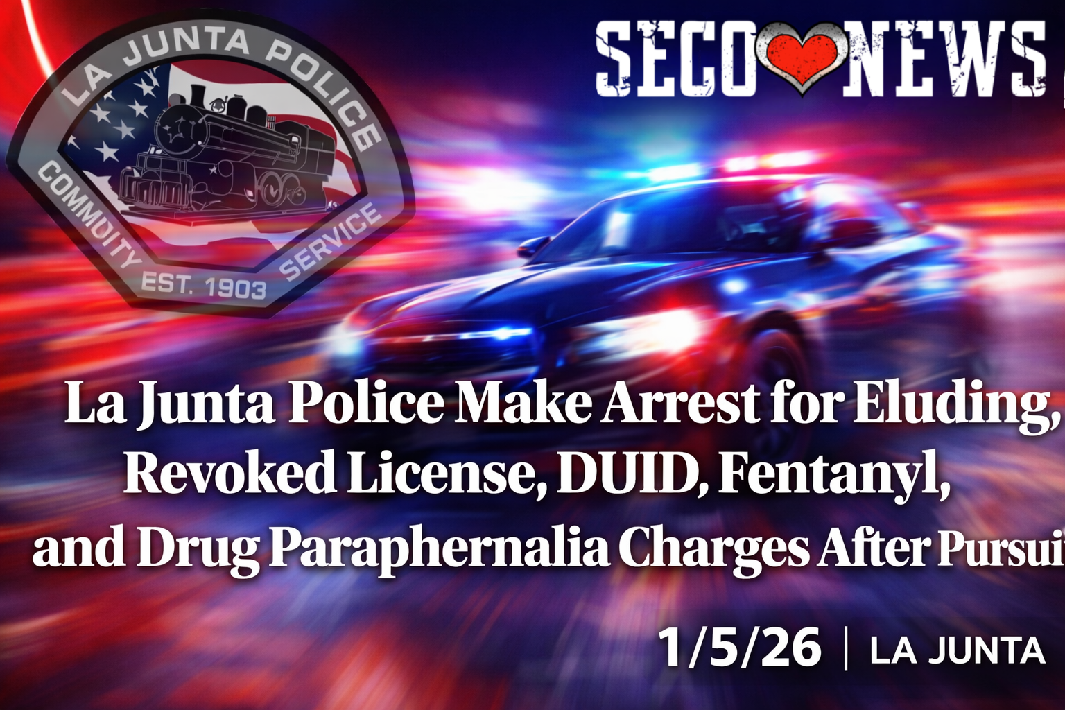 Description: La Junta Police arrested a driver following a vehicle pursuit on Jan. 5, 2026, after officers discovered fentanyl, drug paraphernalia, and an open alcohol container during a traffic stop near Highway 50. All Parties Considered Innocent Until Proven Guilty in a Court of Law.