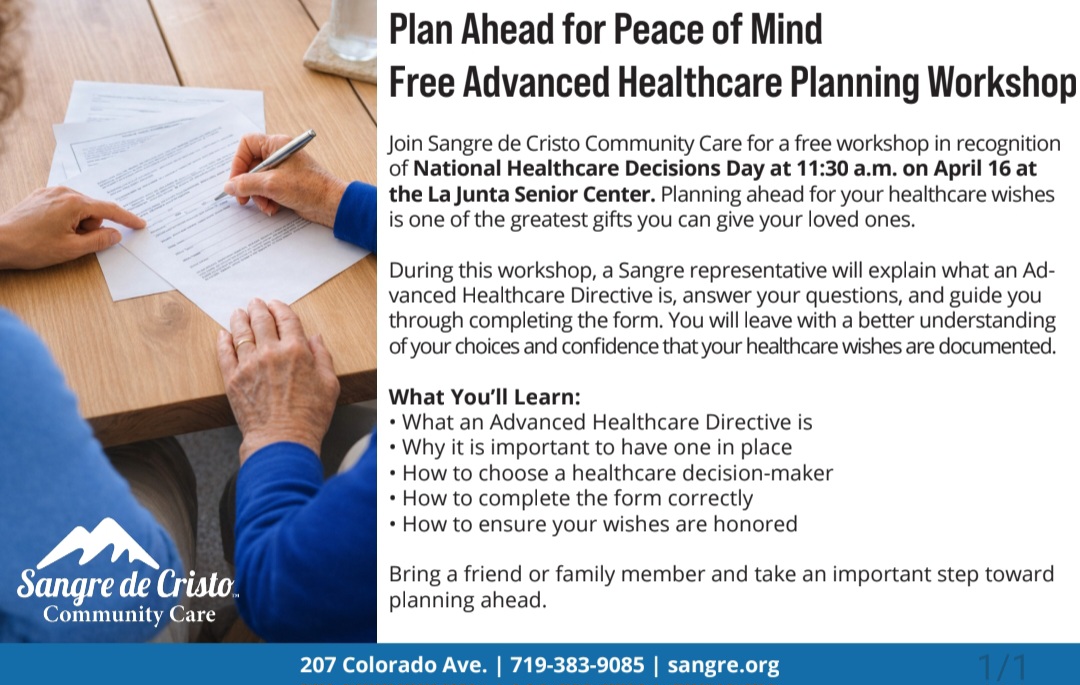 Join Sangre de Cristo Community Care for a free workshop in recognition of National Healthcare Decisions Day at 11:30 a.m. on April 16 at the La Junta Senior Center. Planning ahead for your healthcare wishes is one of the greatest gifts you can give your loved ones.