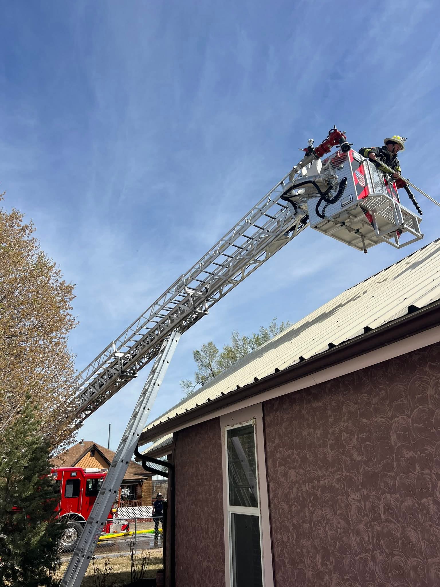 The ladder truck was deployed to help gain access to the peak of the roof since it was metal roofing.