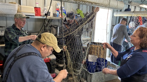 Volunteers inspect and repair nets daily during walleye spawning operations at the Lake Pueblo facility.