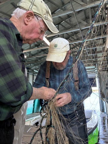 (Vertical) Volunteers Russ Dewey and Dan Frankowski repair nets daily during walleye spawning operations at Lake Pueblo boathouse.