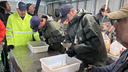 During spawning, biologists gently collect eggs (roe) from female fish, milt from male fish, and combine them in a controlled fertilization process. The eggs and milt are stirred with goose feathers, a technique that allows them to be stirred gently without damage.