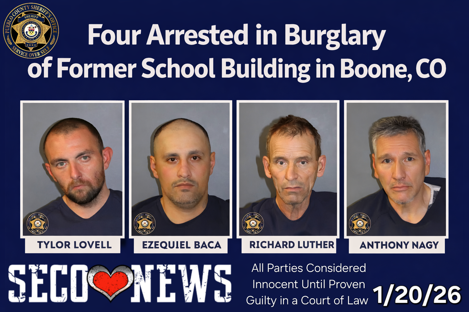 Luther, Lovell, Baca and Nagy were each arrested for second-degree burglary, possession of burglary tools, criminal mischief and criminal attempt. They were booked into the Pueblo County Jail.