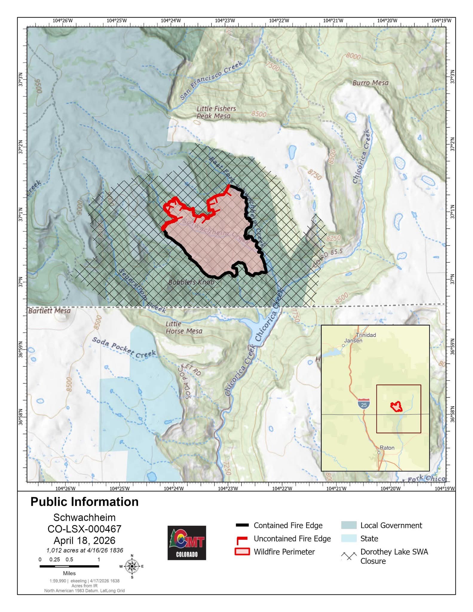 Description: Latest Schwachheim Fire update (April 18, 2026): wildfire southeast of Trinidad, Colorado is 63% contained at 1,012 acres. Firefighters continue mop-up efforts and may conduct controlled burns as weather moderates.